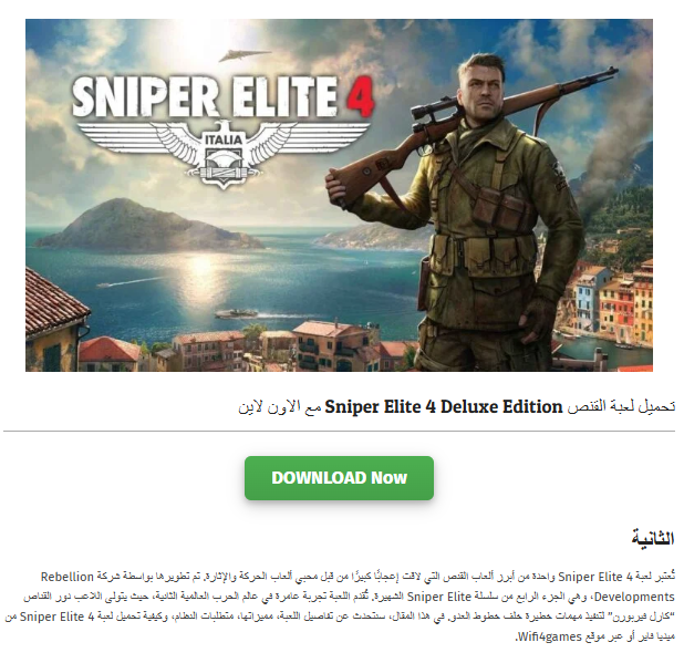 Sniper Elite 4 Experience unparalleled sniping freedom in the biggest and most sophisticated World War 2 shooter ever created. Engage in strategic third-person combat, make gameplay decisions, and unleash spectacular longshots throughout expansive terrains as you free wartime Italy from the clutches of Fascism.